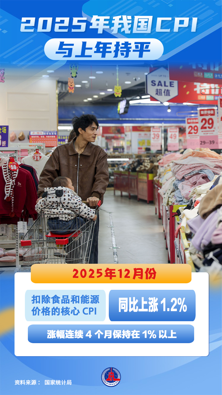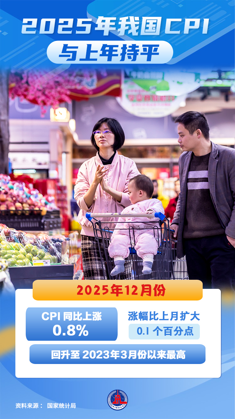 新华社北京1月9日电(记者王雨萧)——国家统计局9日发布数据显示,2025年12月份,全国居民消费价格指数(CPI)环比上涨0.2%,同比上涨0.8%;全年CPI与2024年持平。