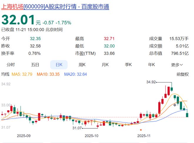 黄铮霖在任期间,上海机场股价走势相对平稳,长期在30~33元间小幅波动。截至11月21日收盘,上海机场股价报32.01元,总市值796.51亿元。