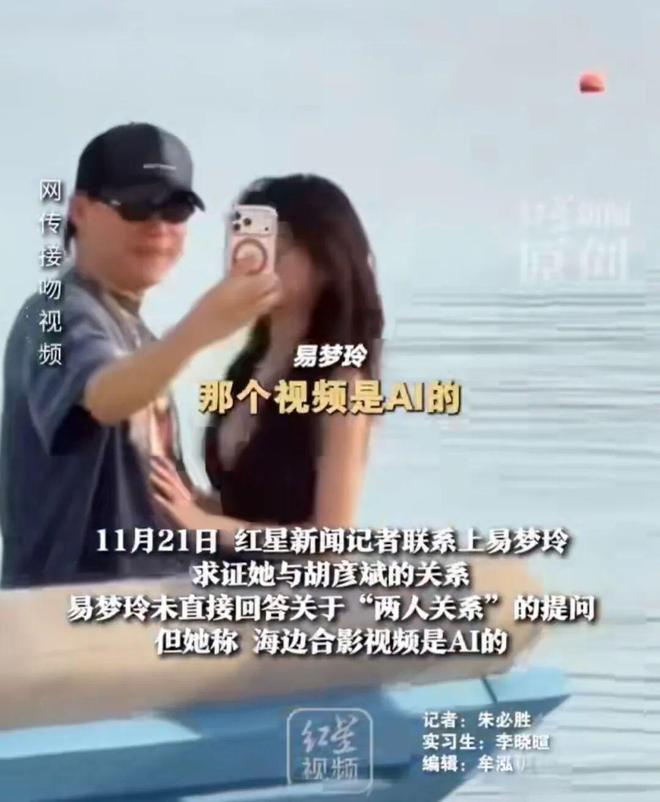 今天下午,红星新闻记者联系上易梦玲,求证她与胡彦斌的关系,易梦玲没有直接回答关于“两人关系”的提问,但她称海边合影视频是ai的。