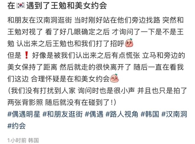 虽然双方都没有出面回应过,也没有什么实打实的实锤证据,只是今年6月份,有网友在首尔汉南洞拍到王勉和一位美女同行,两人并肩逛街时举止亲昵,发现被拍后却火速拉开距离,慌乱避嫌的模样引发了猜测。